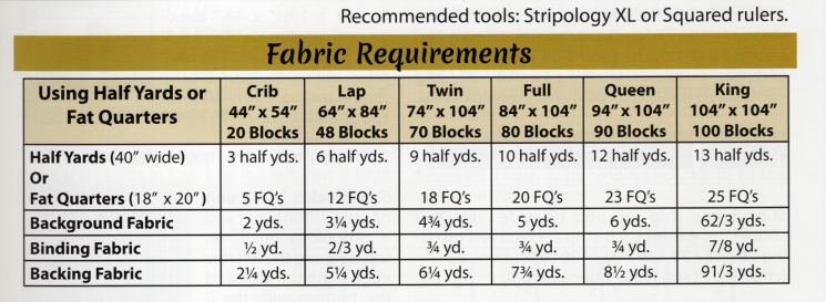 Fabric needs differ based on the size and quilt pattern, refer to the pattern in the book for exact requirements. Half yards and fat quarters are recommended for most. You can make whatever size you'd like during the class!