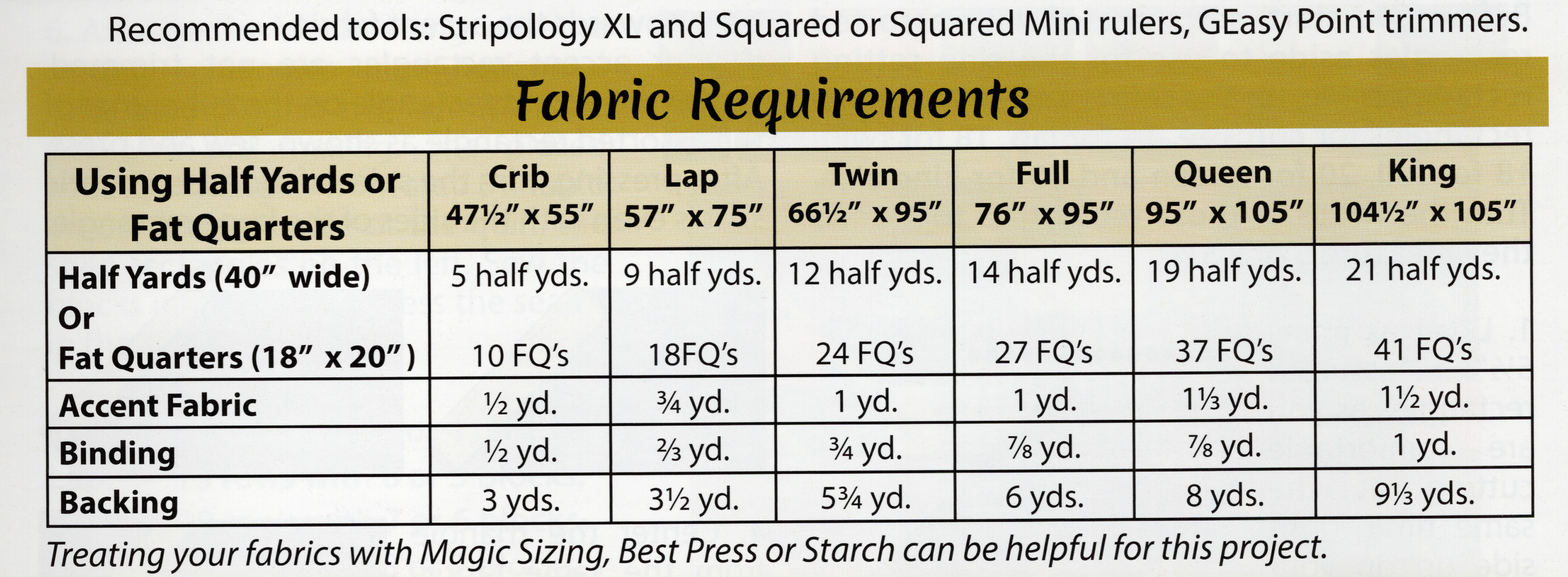 Fabric needs differ based on the size and quilt pattern, refer to the pattern in the book for exact requirements. Half yards and fat quarters are recommended for most. You can make whatever size you'd like during the class!