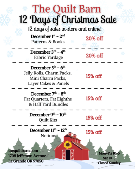 We are running a 12 Days of Christmas Sale, in store and online! It's a perfect time to pick up the fabric or tool that you've been eyeing!